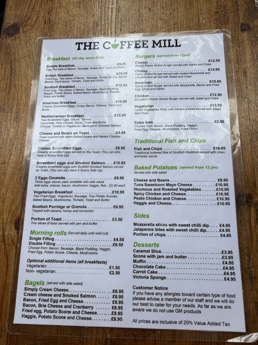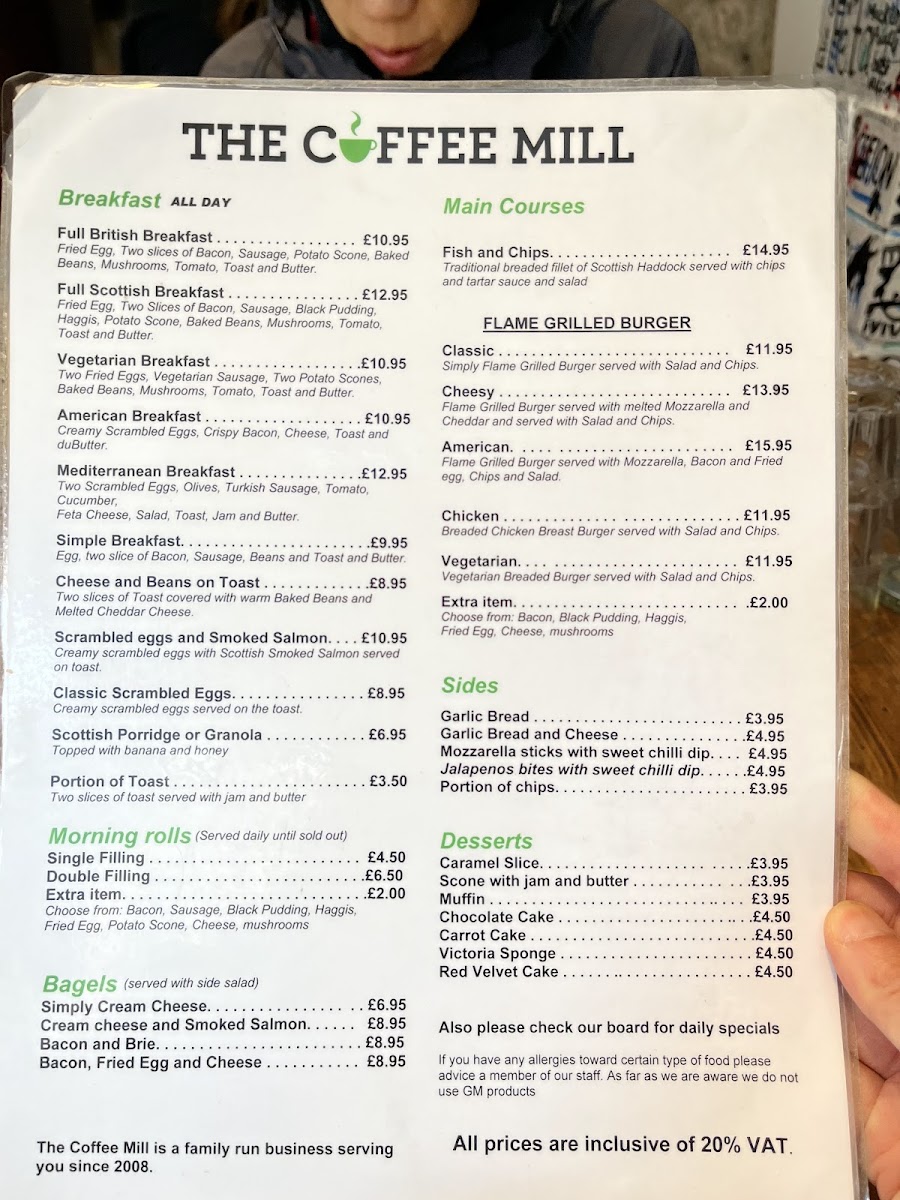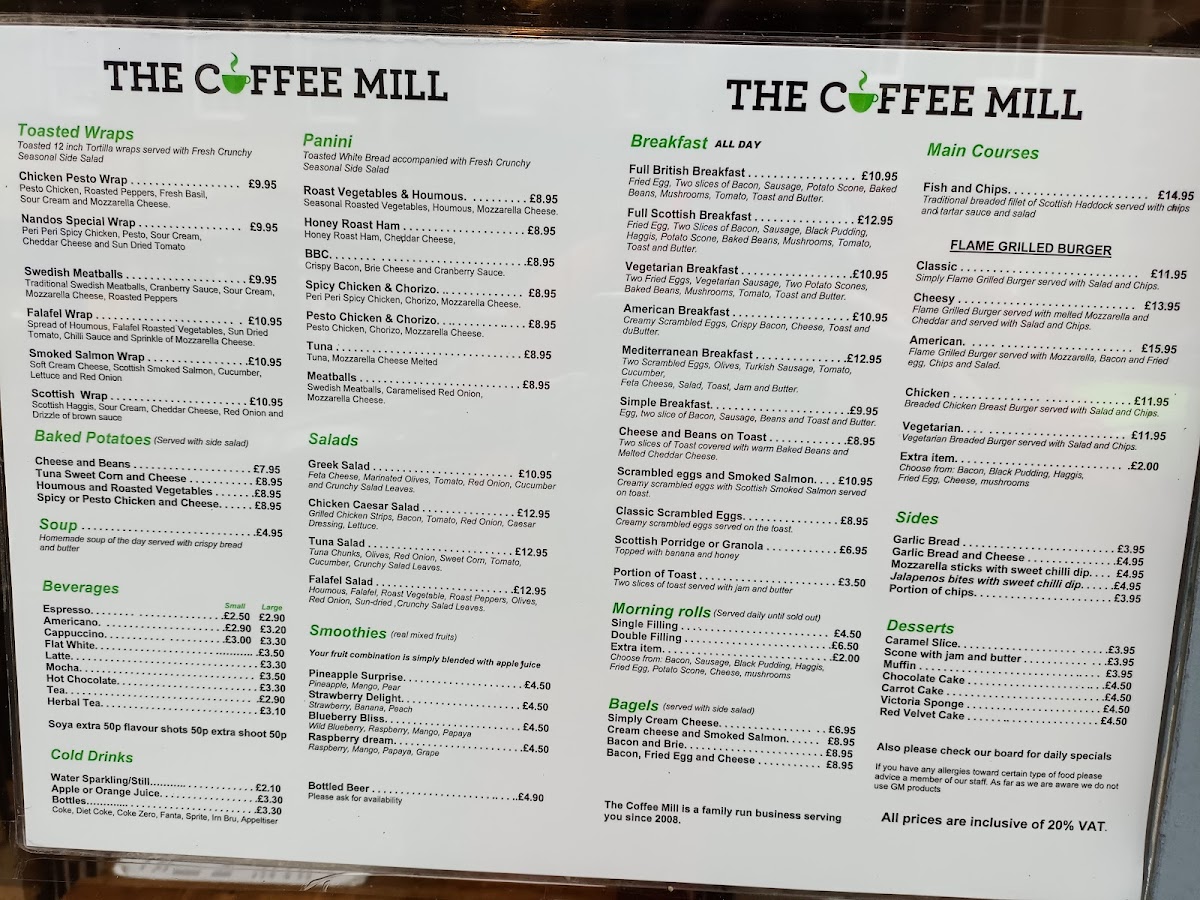 Fried Egg, Two Slices of Bacon, Sausage, Black Pudding, Haggis, Potato Scone, Baked Beans, Mushrooms, Tomato, Toast and Butter.