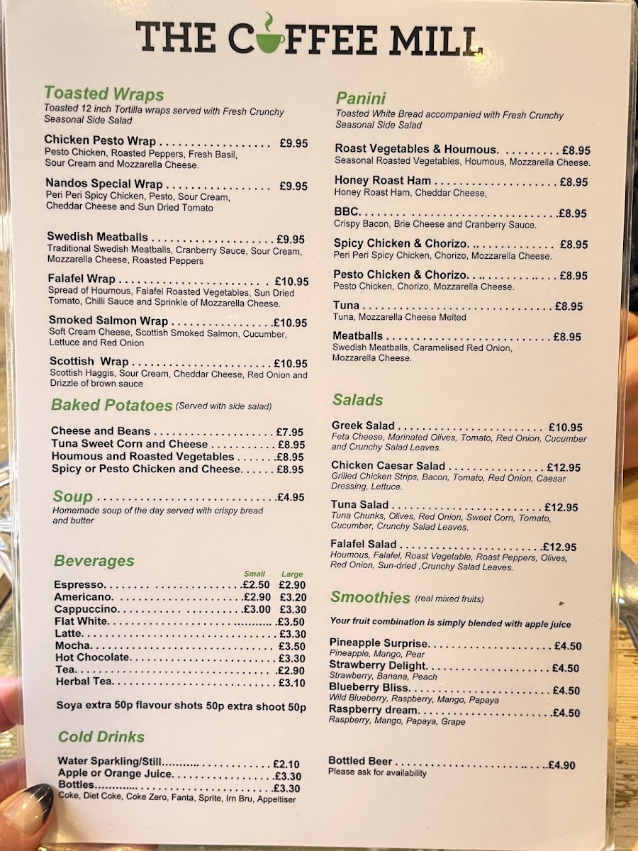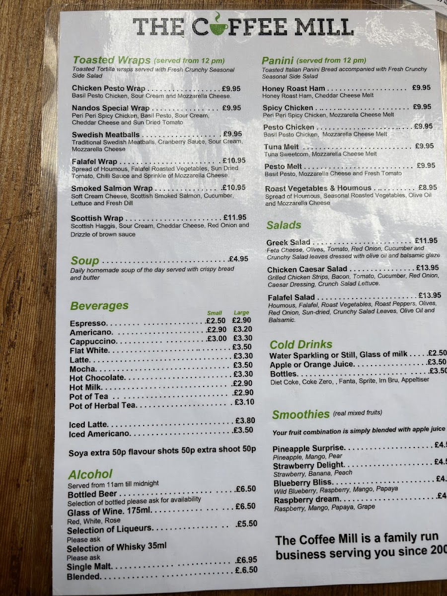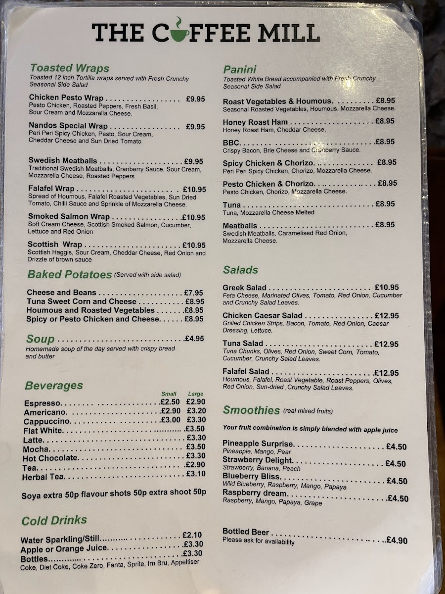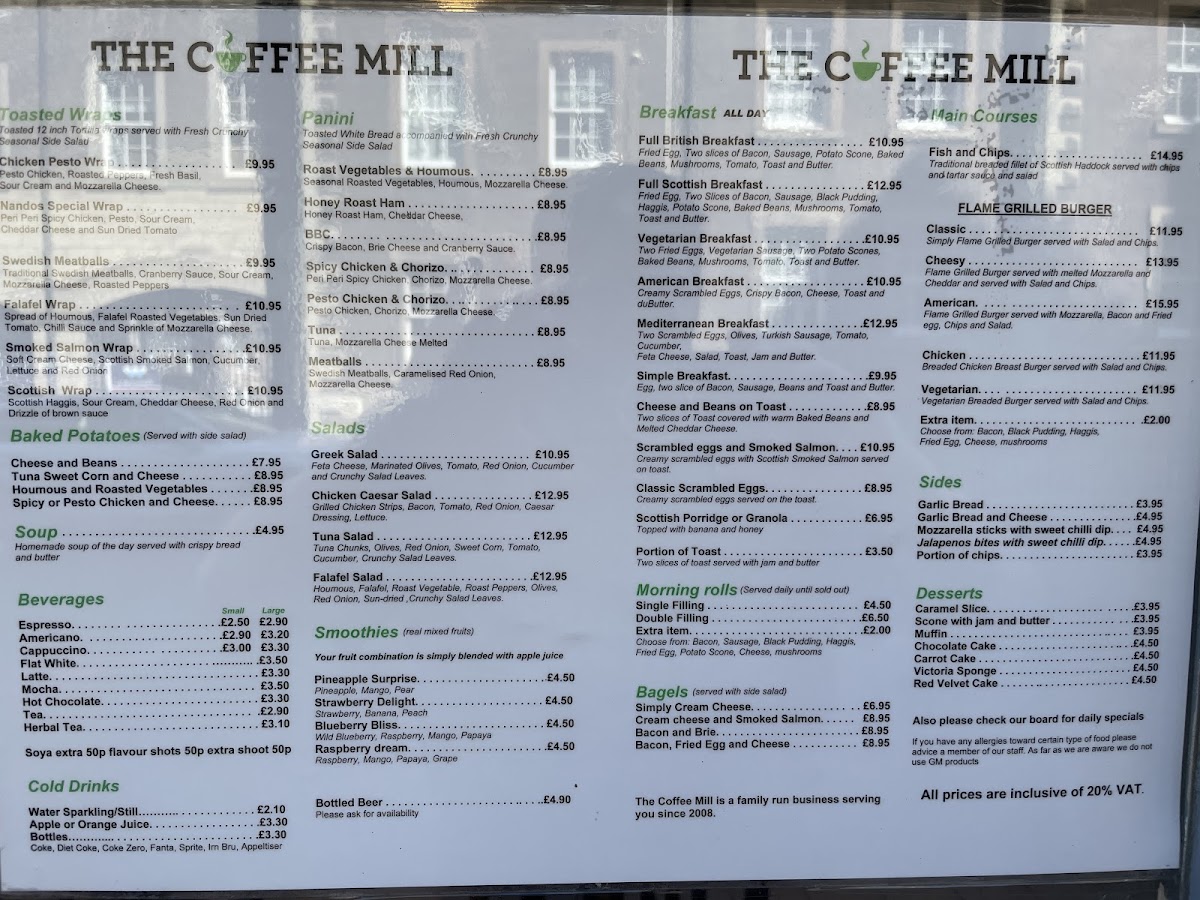 Fried Egg, Two Slices of Bacon, Sausage, Black Pudding, Haggis, Potato Scone, Baked Beans, Mushrooms, Tomato, Toast and Butter.